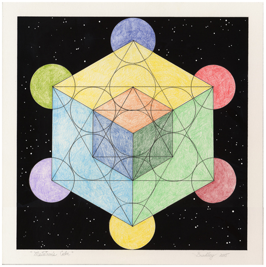 TITLE: "Metatron's Cube" PRICE: $165 unframed (available) SIZE: 10 inches wide by 10 inches high (unmatted) MEDIA: Mixed media: Berol Prismacolor colored pencils, gouach and archival black permanent drawing ink DATE OF COMPLETION: December 19, 2015 I worked 12 hours today on a new painting -- from beginning to end. It is 10" x 10" and is called "Metatron's Cube." This piece is the first in a series of paintings which now include two additional media -- Berol Prismacolor colored pencils and archival black permanent drawing ink. The sky continues to be painted in gouache, an opaque watercolor. Stars, also in gouache, were added last. The pen used was a .05mm Micron pen. This painting was done on one (of 10) 20" x 30" acid-free Strathmore illustration boards - purchased at a great 50% off price due to a customer's returning the unopened package for something else. It is great to work with. Many of my older paintings were done using it. I've been getting interested in mandalas as well as 2 to 3-dimensional designing of polygons using circles and geometry. Mandalas are interesting in that they have spiritual and "universal" attributes. The are found to have healing qualities when used in meditation. The intriguing thing about these "constructions" is that virtually all 3-dimensional polygons found in nature are created based on these 3D "arrangements" of spheres -- all placed as you see them here in Metatron's Cube. See the link in my comment for more details on Metatron. The painting is intended to be framed with its 3/8" white space showing all around the piece [the title, signature and date are shown in it.] AND have a 2 1/2 inch warm white mat and a simple pewter finish metal frame and UV-glass. Forward Main List |